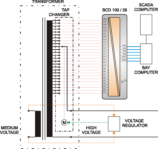 High to medium voltage transformer tap changer position defines transformer output voltage. For SCADA operator is important to know which tap is currently in use. That information is usually provided by bay computer. Tap changer has many tap positions and that would take many terminals, cable wires and digital inputs on bay computer, which is not economic. BCD decoder reduces that cost by transforming 26 (BCD 100 / 26) or 36 (BCD 100 / 36) tap changer position into 6 with BCD code without additional power supply.
