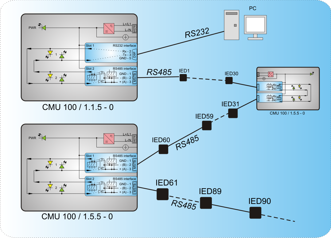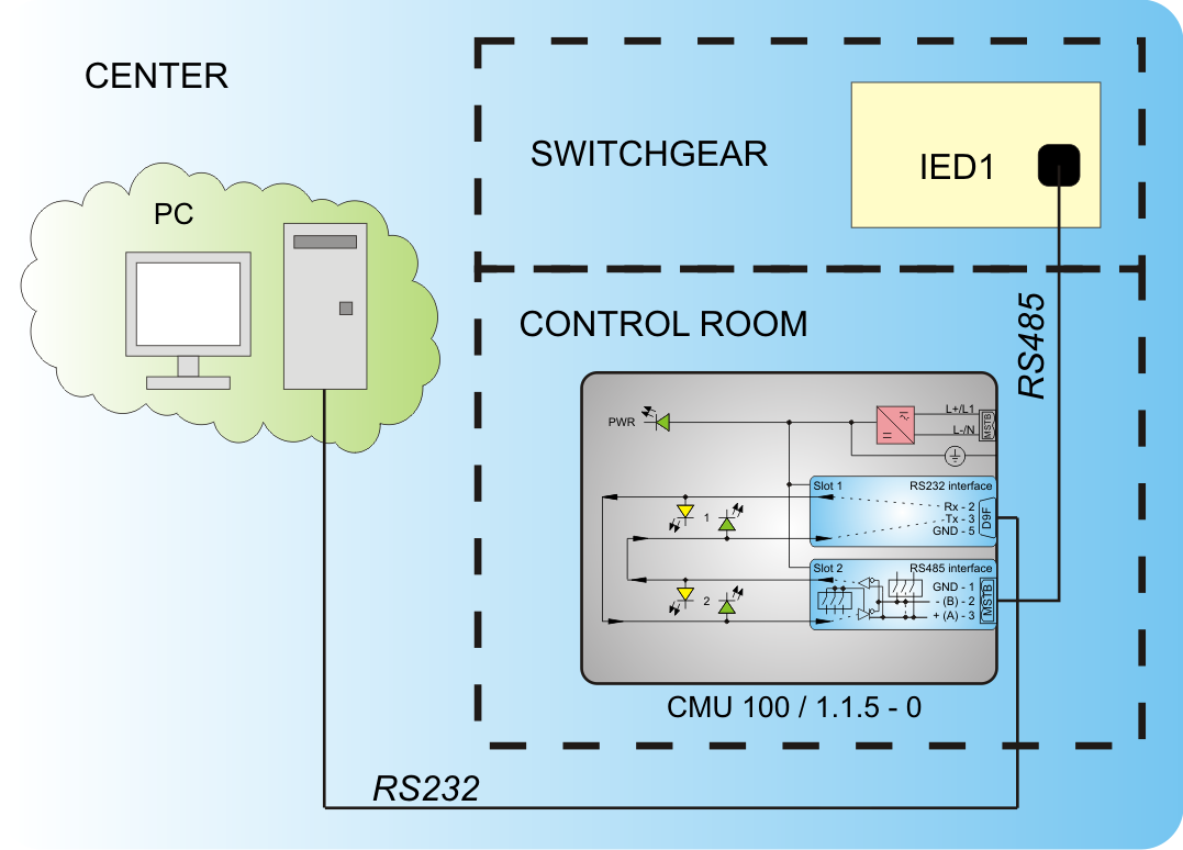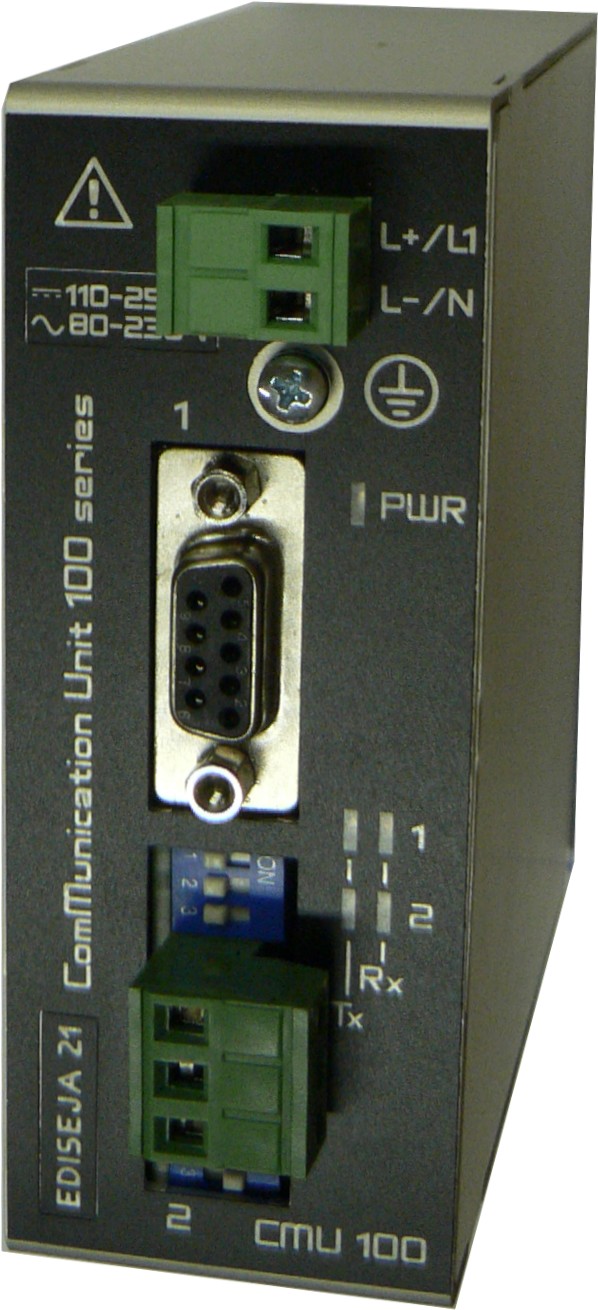 This type of CMU 100 device is RS232 to RS485 converter. Data is converted from RS232 to RS485 optic and vice versa.