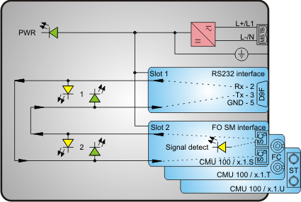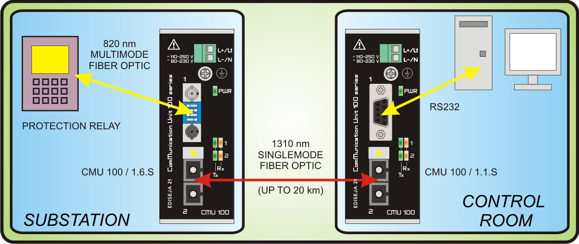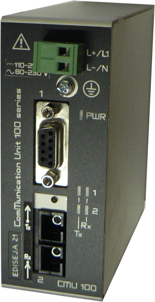 This type of CMU 100 device is RS232 to singlemode fiber optic converter. Data is simultaneously converted from RS232 to singlemode fiber optic and vice versa.