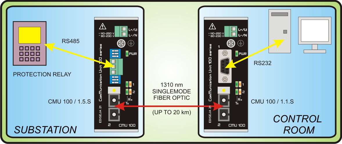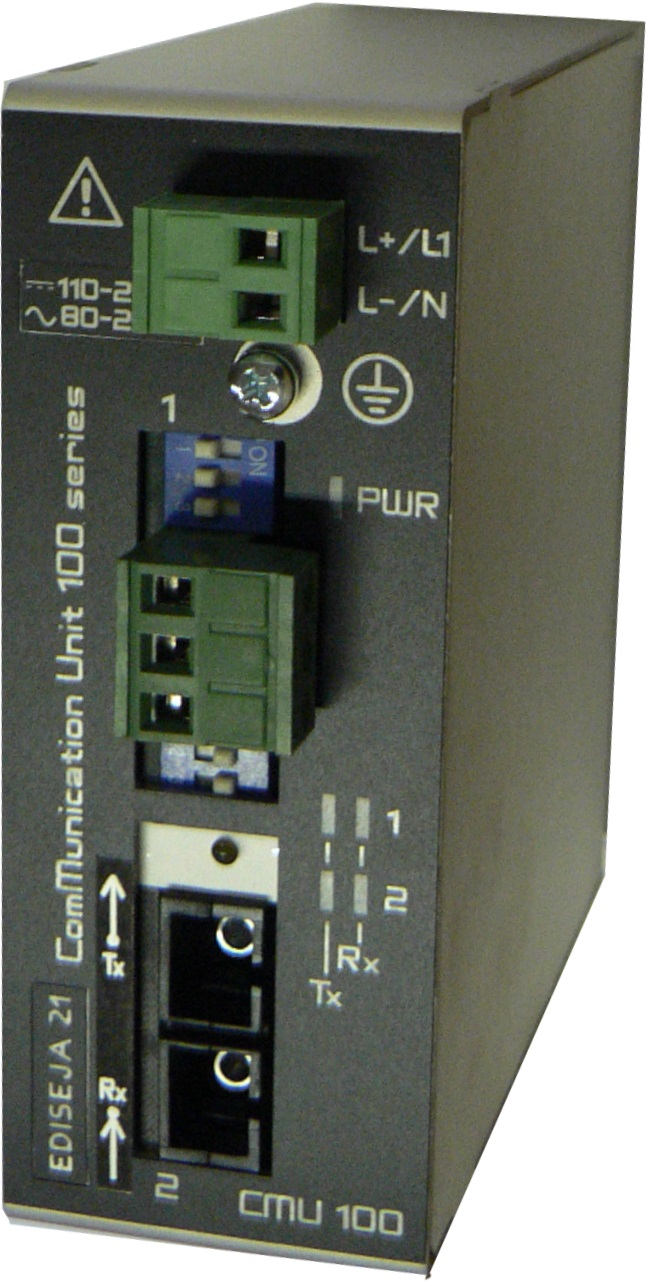 This type of CMU 100 device is RS485 to singlemode fiber optic converter. Data is simultaneously converted from RS485 to singlemode fiber optic and vice versa.