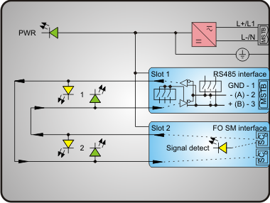 Converter has LED indication for power and LED indication for Rx and Tx lines for each interface.