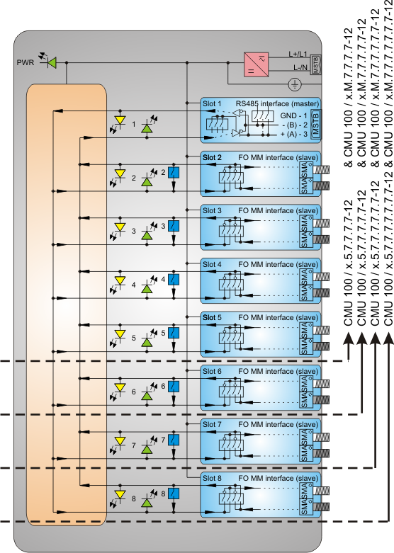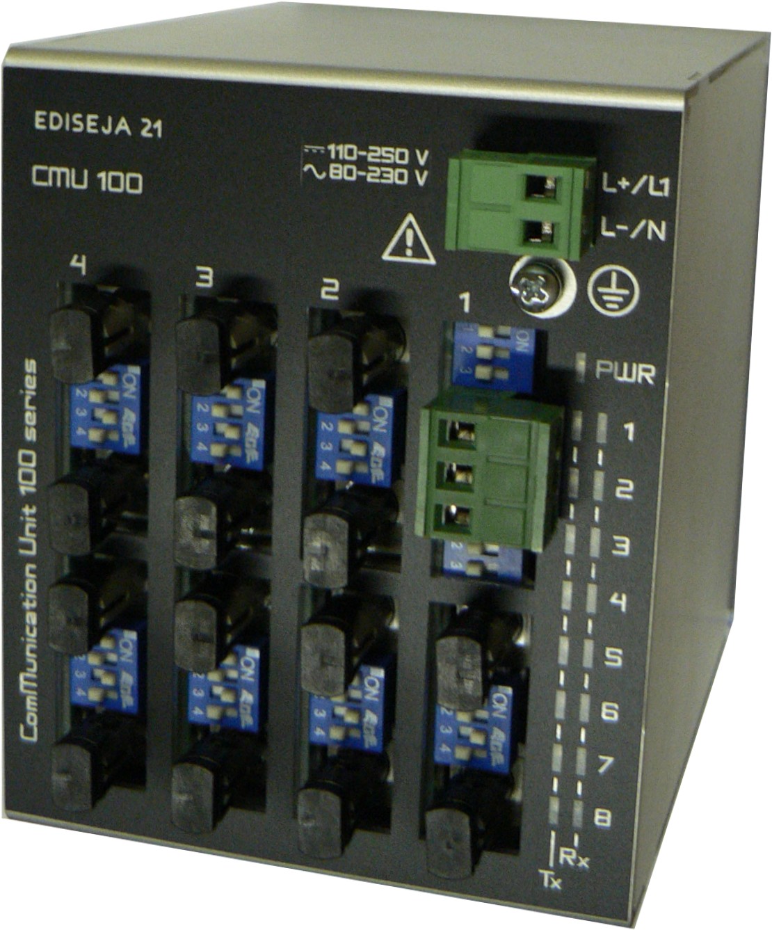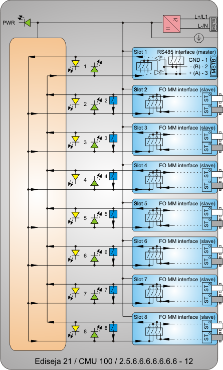 Star also coupler has 4x, 5x, 6x or 7x full duplex, 820 nm wave lenght multimode fiber optic (slave) interfaces with up to 1,5 km distance range, with ST or SMA connector and has user changable positive (light OFF when idle) or negative (light ON when idle) logic.