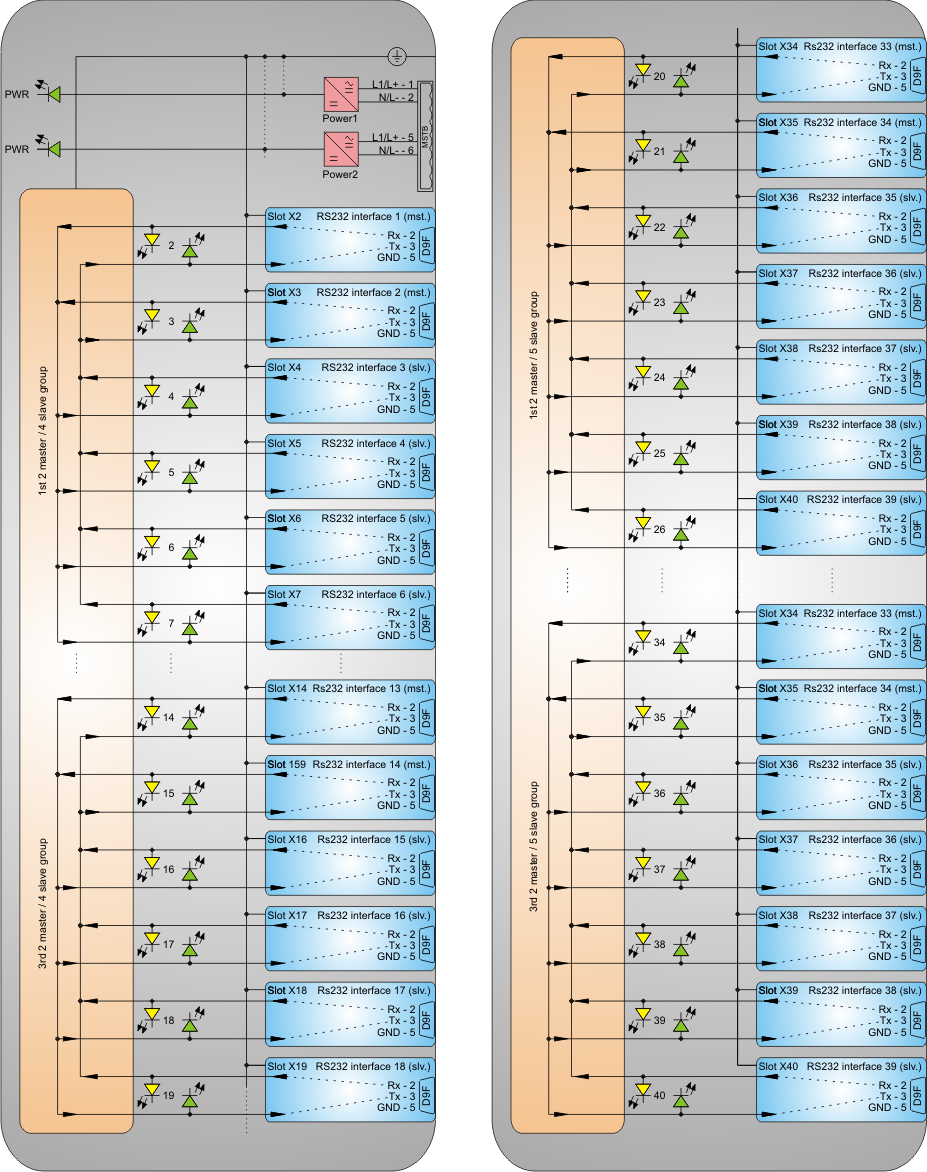 2x RS232 (MASTER) TO 4x RS232 (SLAVES) (3 GROUPS) & 2x RS232 (MASTER) TO 5x RS232 (SLAVES) 3 GROUPS STAR COUPLER | |||
