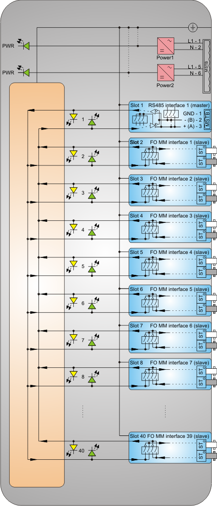 40 port communication media converter / star coupler CMU 100 provides a customer many options with designing his communication with equipment on the substation (protection relays, voltage regulators, energy meters,.....). It provides conversion between RS232, RS485, multimode (660 nm - plastic & 820 nm - glass) fiber optic, singlemode (1300 nm & 1310 nm) fiber optic, 10/100BASE-TX (ethernet) and 100BASE-FX (fiber optic ethernet). Converters power supply is designed for standard substation voltages; 24 V DC, 48 V DC, 110 V DC, 125 V DC, 220 V DC, 230 V AC.